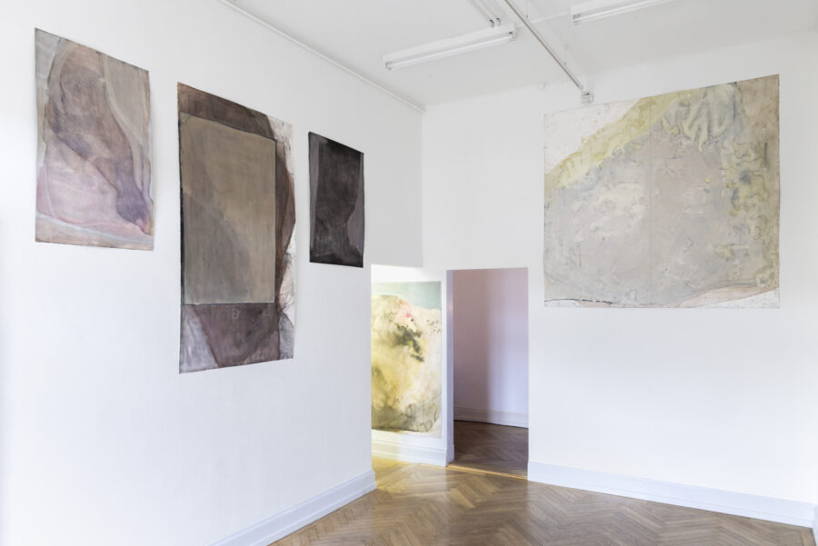 Die ersten beiden Ausstellungsräume sind den Werken von Thomas Hauri gewidmet. Die vier Meter hohen Räume werden durch die Positionierung der Werke komplett ausgereizt und bringen so die Körperlichkeit des Raumes selbst, die Architektur, mit in den Dialog. Die installativ präsentierte Werkgruppe überrascht zunächst durch ihre Oberflächen: Was auf den ersten Blick wie Holz, Leinwand oder gar Stein wirkt, entpuppt sich bei näherer Betrachtung als Büttenpapier. Die Arbeiten entwickeln eine komplexe Morphologie von Oberflächen, in der sich Spuren des Herstellungsprozesses einschreiben. Dabei drängt sich eine Analogie zur Haut auf, dem grössten menschlichen Sinnesorgan, das den Körper nach aussen hin begrenzt und zugleich durchlässig für Einwirkungen und Erinnerungen ist.