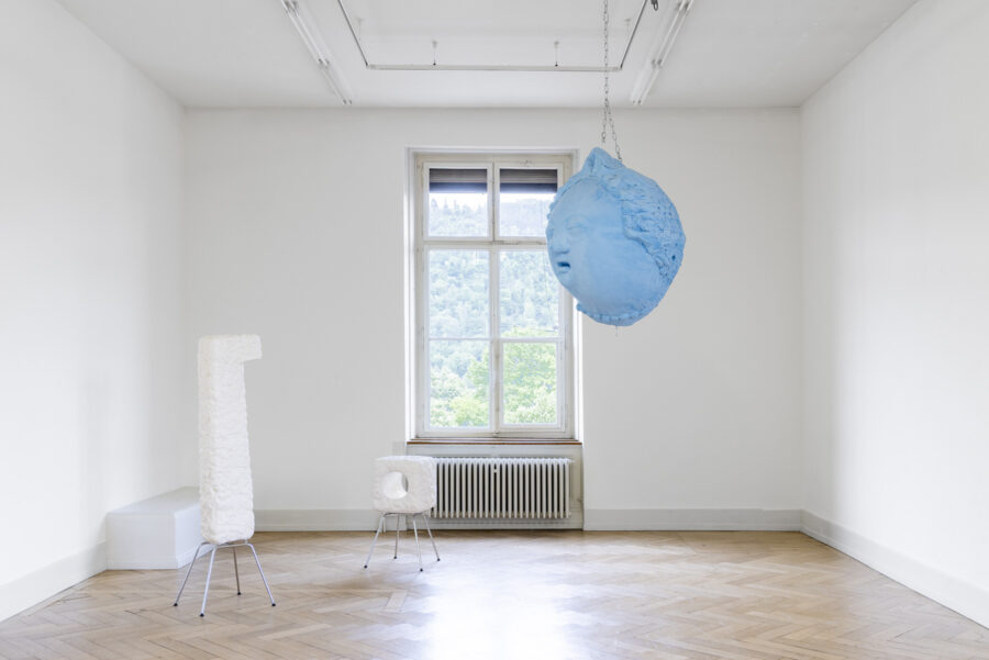 Auch bei Pawel Ferus steht der Körper im Zentrum, jedoch als Träger von Kommunikation – und deren Scheitern. Ein aufgeblasener, überdimensionierter blauer Kopf eines Puttos hängt von der Decke und dreht sich unablässig um die eigene Achse. Er wirkt, als wäre er vom eigenen, scheinbar endlosen Atem angetrieben. Die Arbeit mit dem Titel «Snooze» evoziert einen Zustand zwischen Aktivität und Stillstand, zwischen Handlung und Verweigerung.