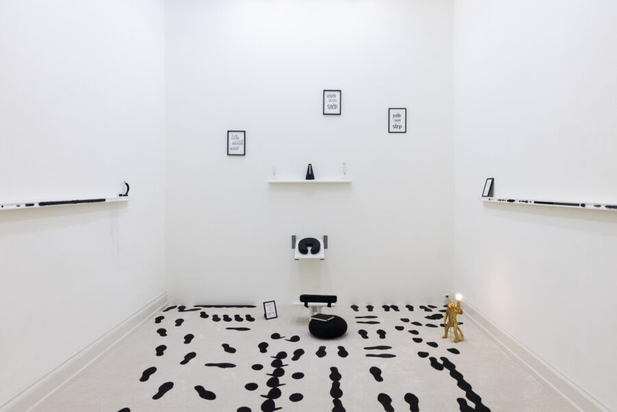 Ein den gesamten Boden ausfüllender weicher Teppich mit Abdrücken von Füssen, aber auch anderen Körperteilen, gibt vor, wie sich die Besuchenden im Raum zu bewegen haben. Unweigerlich erinnern die Teppichmarkierungen an die «Dance Diagrams» von Andy Warhol, also visuelle Tanzanleitungen, die gleichermassen auf die Vorstellung des Self-Improvements anspielen. Doch nicht nur die Teppichmarkierungen geben den «Takt» vor. Unterstützt wird die Situationsgestaltung durch ein Metronom, das am Raumende über einem schreinartig inszenierten Massage- und Meditationssetting thront. An den Wänden hängen kleine Bildchen mit verschnörkelten Texten: «Die Ästhetik orientiert sich an Sinnsprüchen à la ‹Live, Laugh, Love›, die man aus Wohnungen kennt, die hier aber ironisiert angewendet werden», erklärt Kuratorin Olivia Jenni. Bei genauerem Hinsehen kippt der Ton der Texte denn auch merklich ins Autoritäre: Aufforderungen wie «Take off your shoes and follow the instructions» lassen die vermeintlich positiven Botschaften als disziplinierende Anweisungen erscheinen.